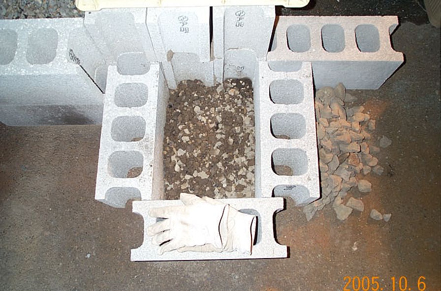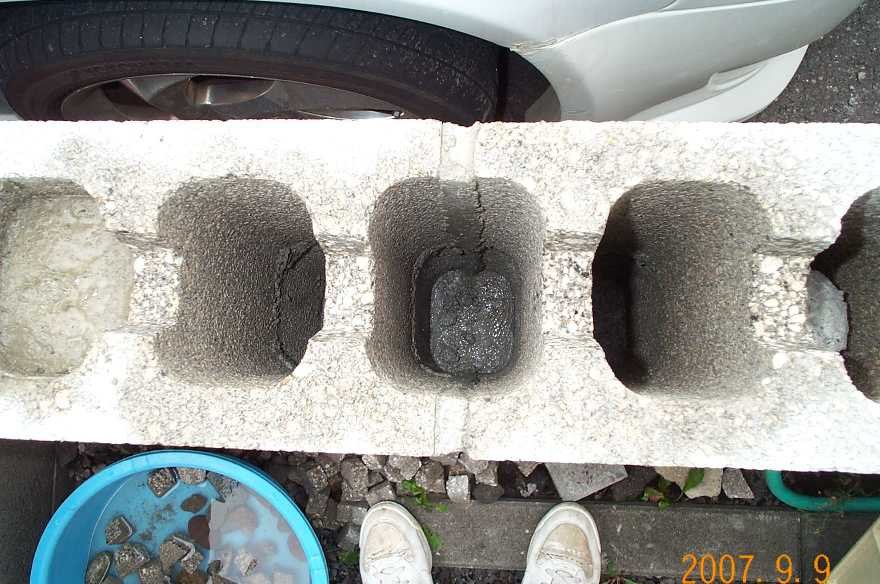 大玉はブロックの穴に入れて、モルタルを節約しました。モルタルだけで何でもやると費用が高くなります。