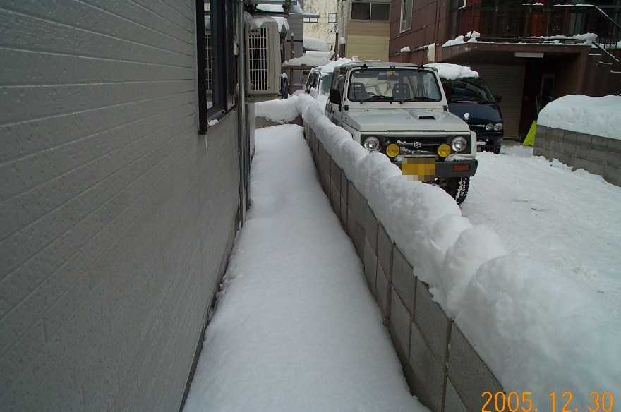 いままで使っていなかった空間でもある、塀と外壁の間を雪捨て場として、雪を押し込んでみとところ、結構な量を入れることができました。