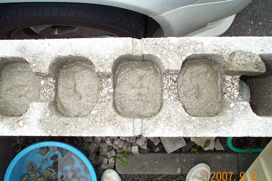 地表に出る部分の下半分、4段目までは、基礎としての強度や重量が必要だと思い、ブロックの穴部分にも全てモルタルや石を詰めました。